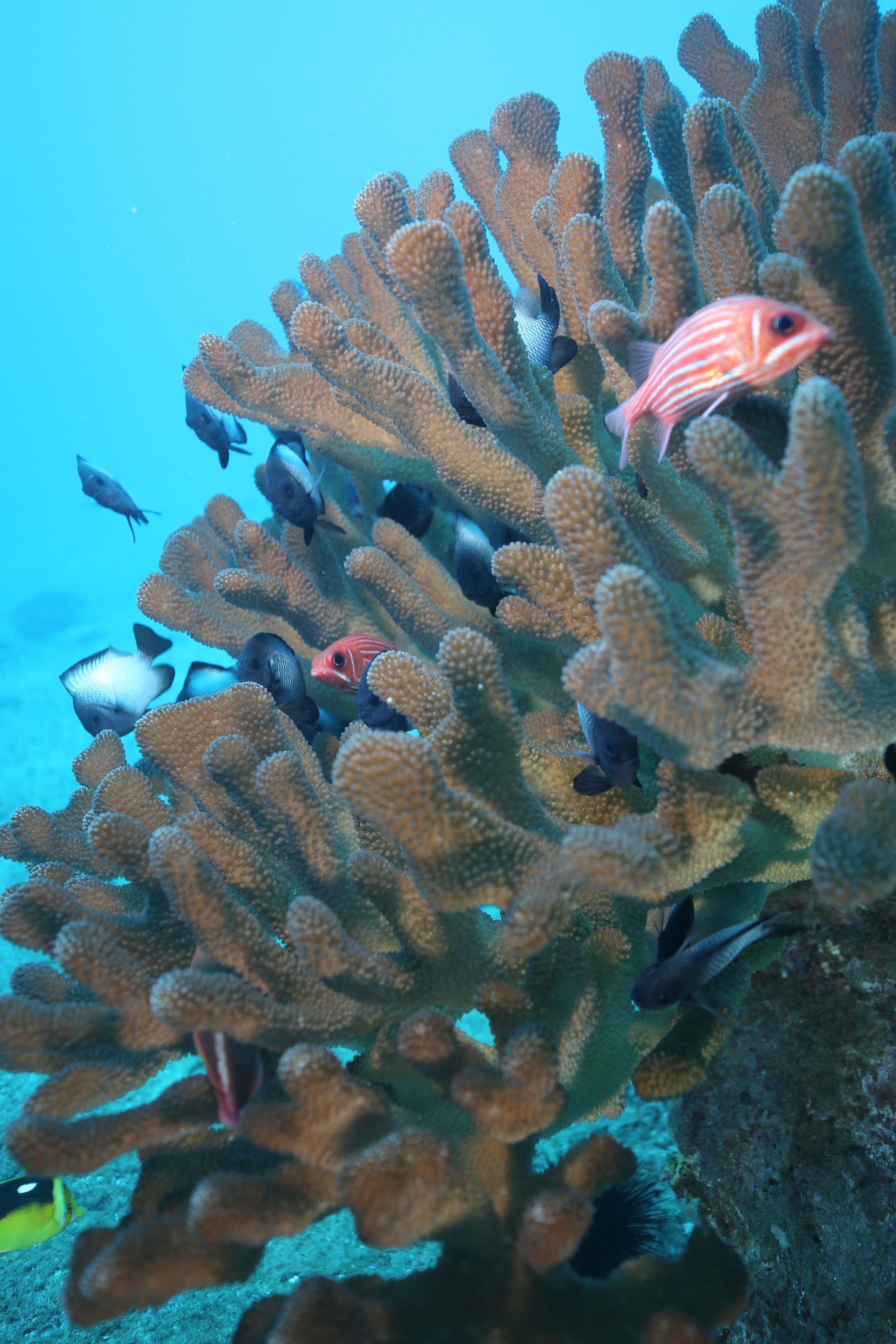 South side of Kauai diving today and just hunting for some good specimens that were acting photogenic. Large shoals of Pyramid Butterflies (Hemitaurichthys polylepis) and Bluestripe Snapper (Lutjanus kasmira) making their way around the reef. The very shy but major in heart and minor in size stars of the show were two dwarf angelfish: the Flame Angel (Centropyge loricula) and the Fisher’s Angel (Centropyge fisheri). Both are small, fast, and hard to snap, but they did give us some glimpses today.