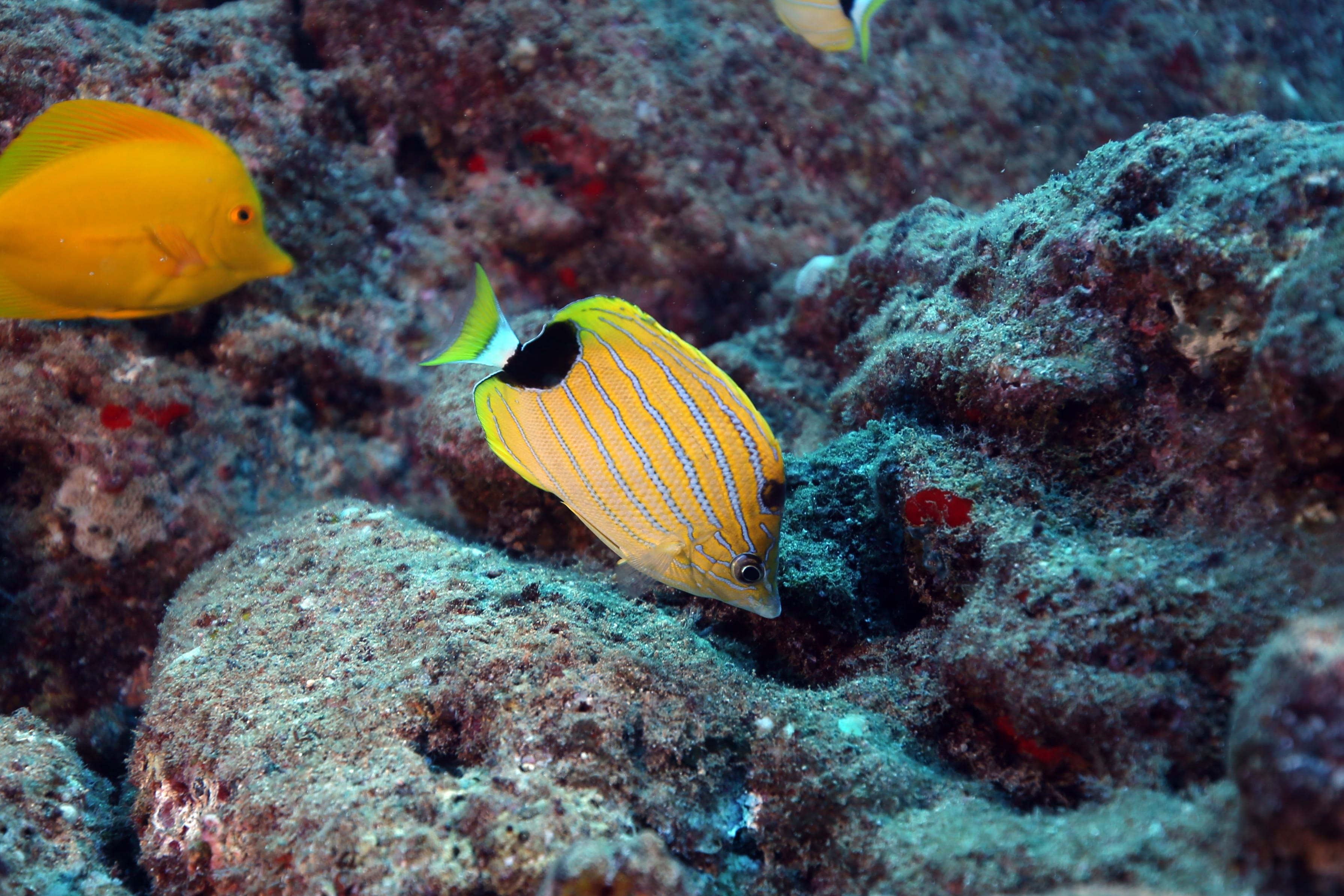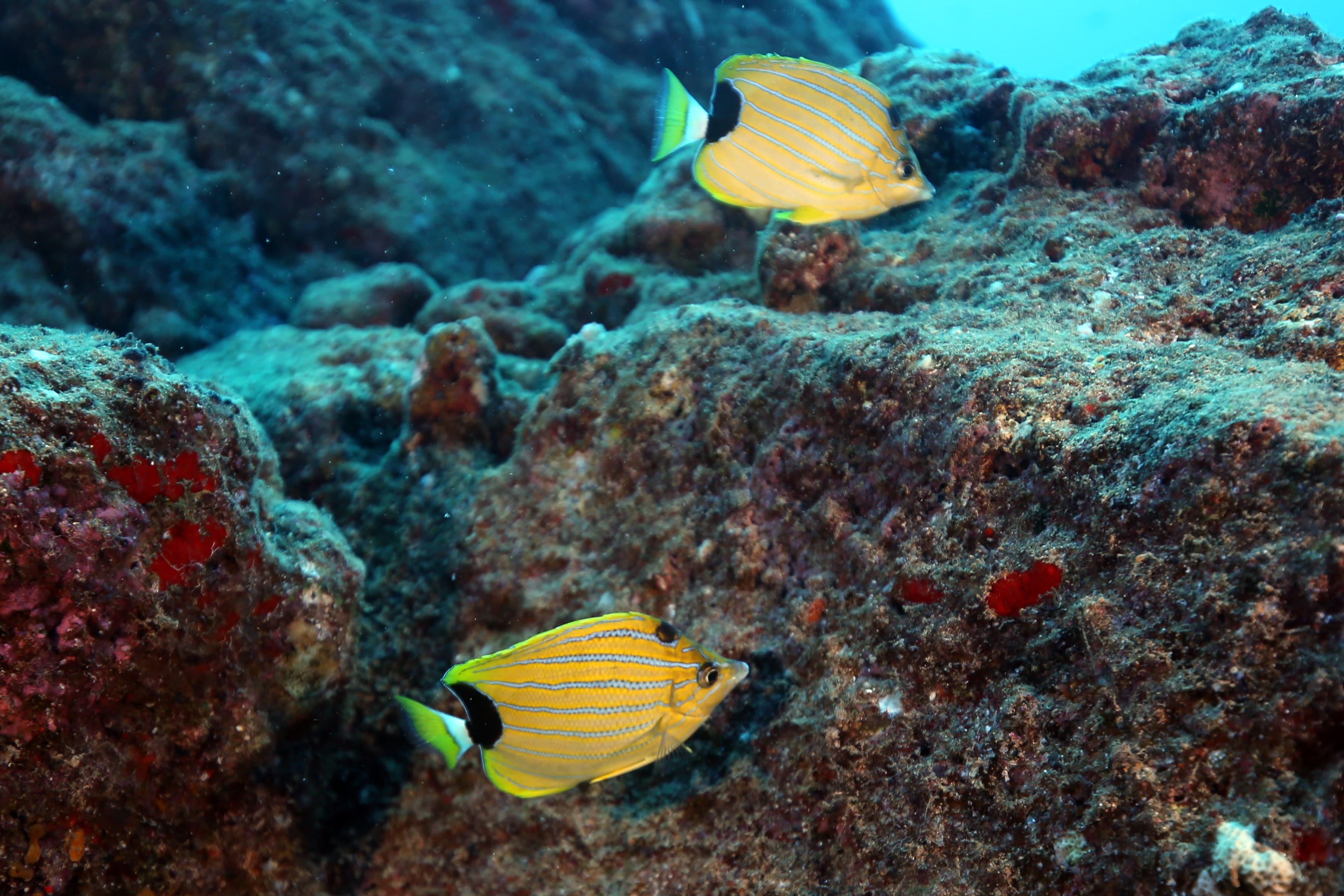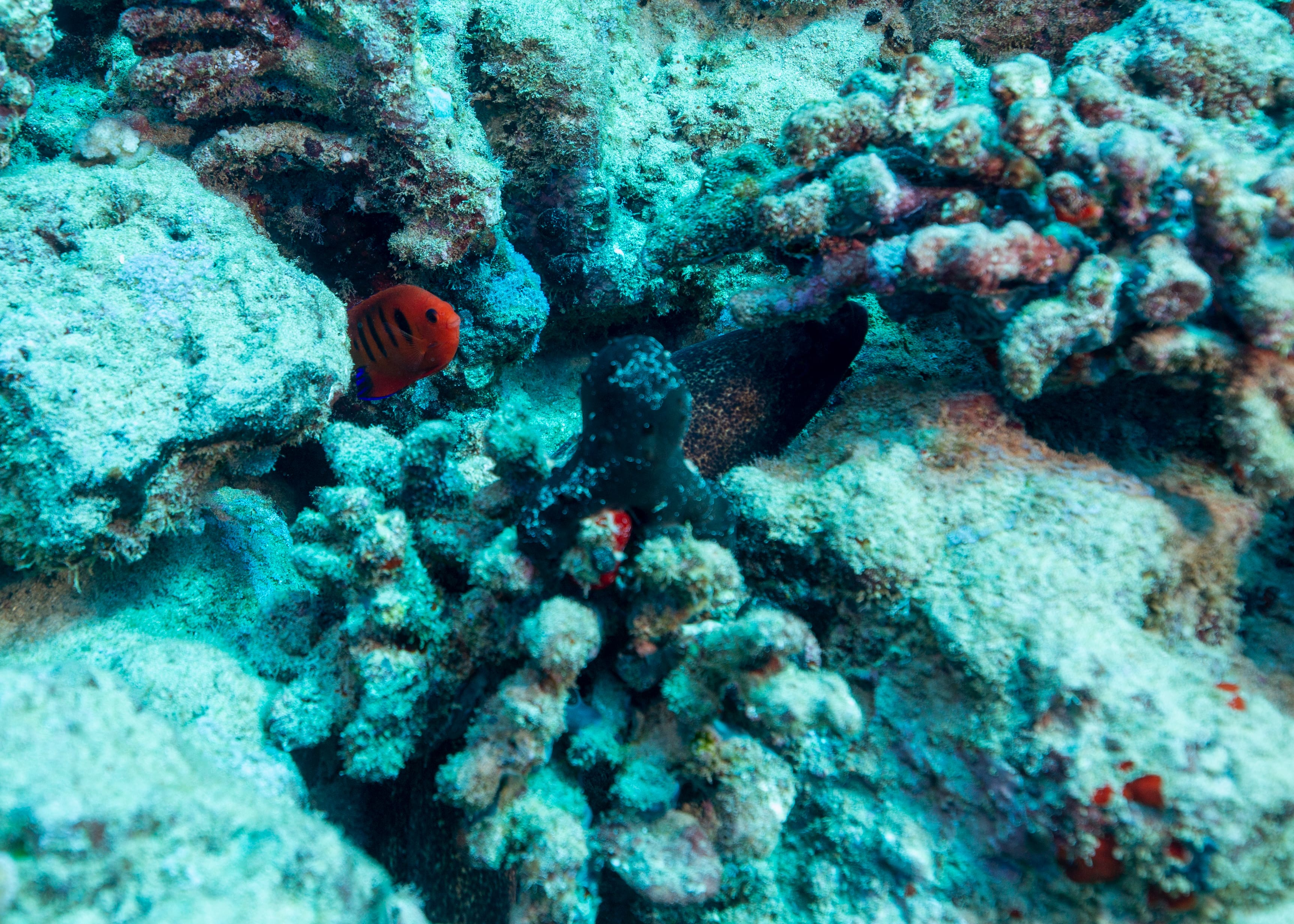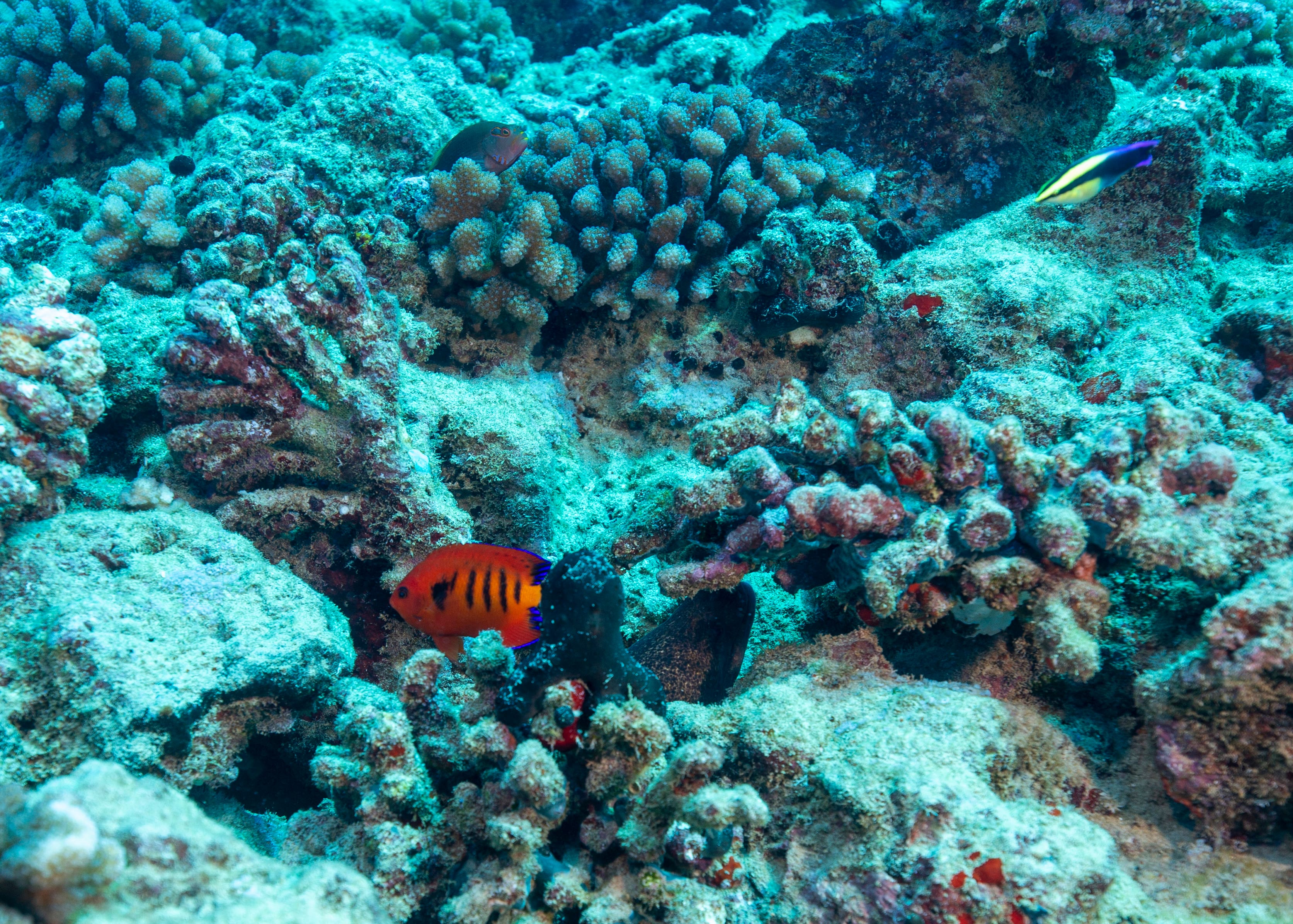 South side of Kauai diving today and just hunting for some good specimens that were acting photogenic. Large shoals of Pyramid Butterflies (Hemitaurichthys polylepis) and Bluestripe Snapper (Lutjanus kasmira) making their way around the reef. The very shy but major in heart and minor in size stars of the show were two dwarf angelfish: the Flame Angel (Centropyge loricula) and the Fisher’s Angel (Centropyge fisheri). Both are small, fast, and hard to snap, but they did give us some glimpses today.