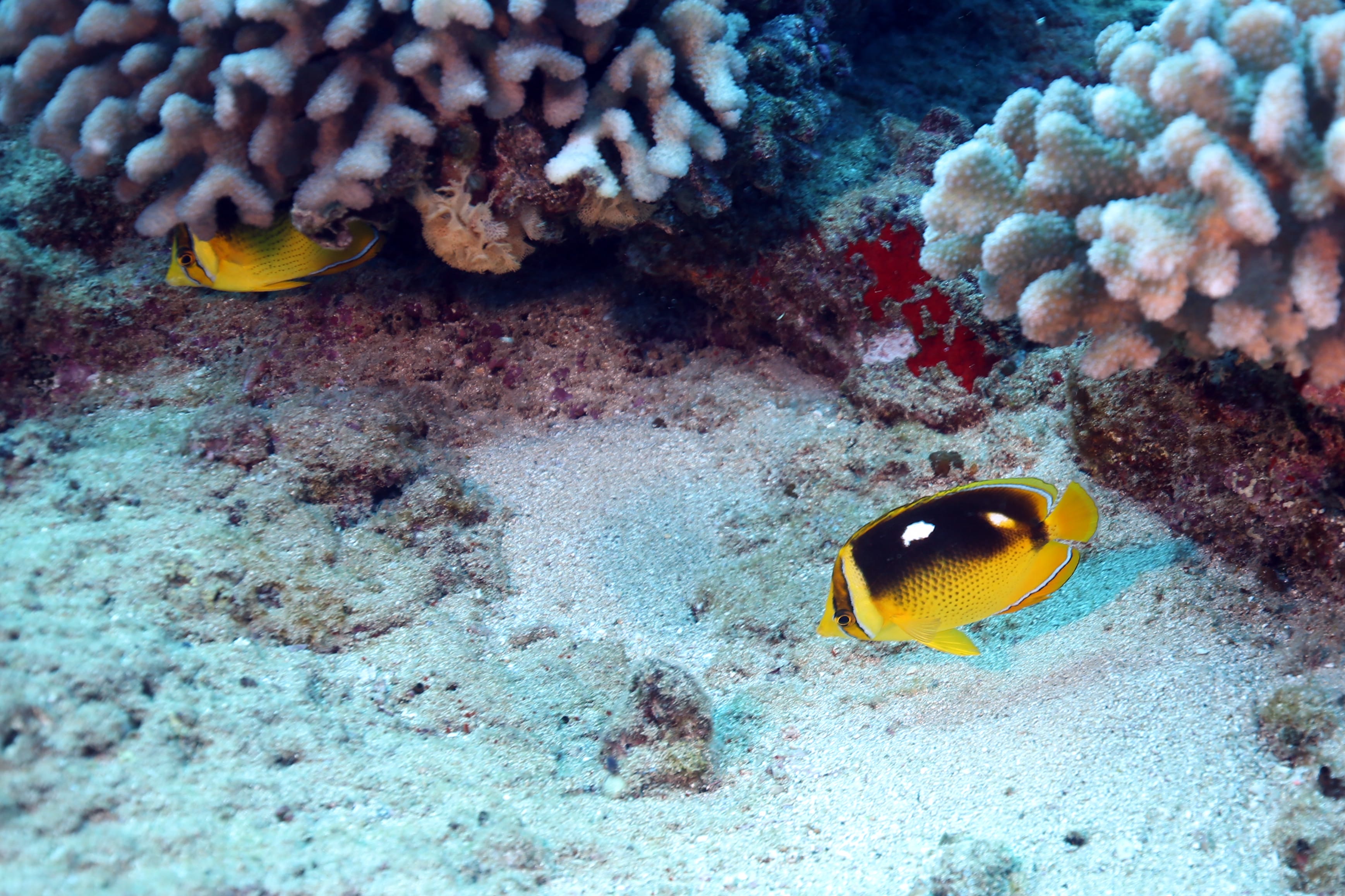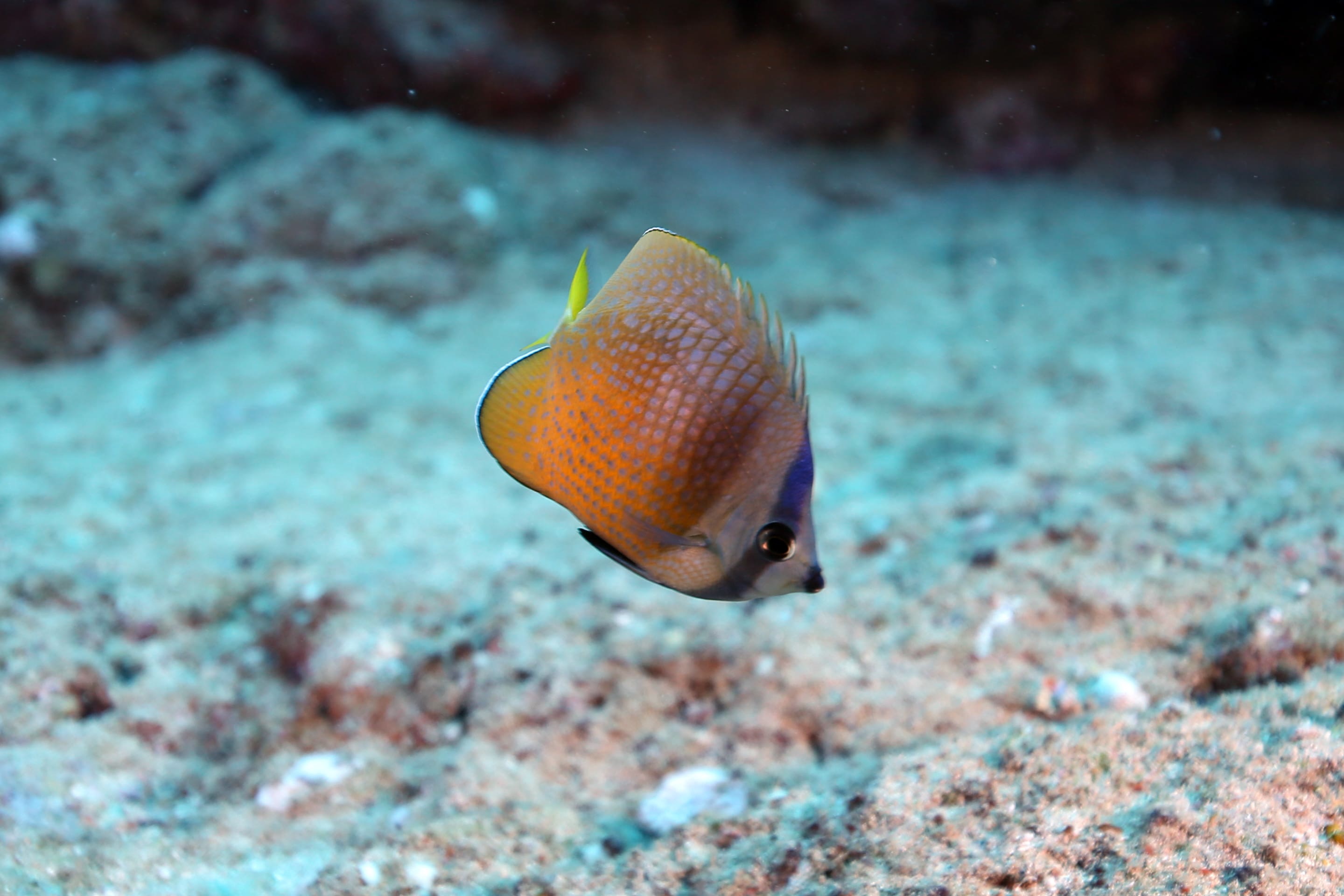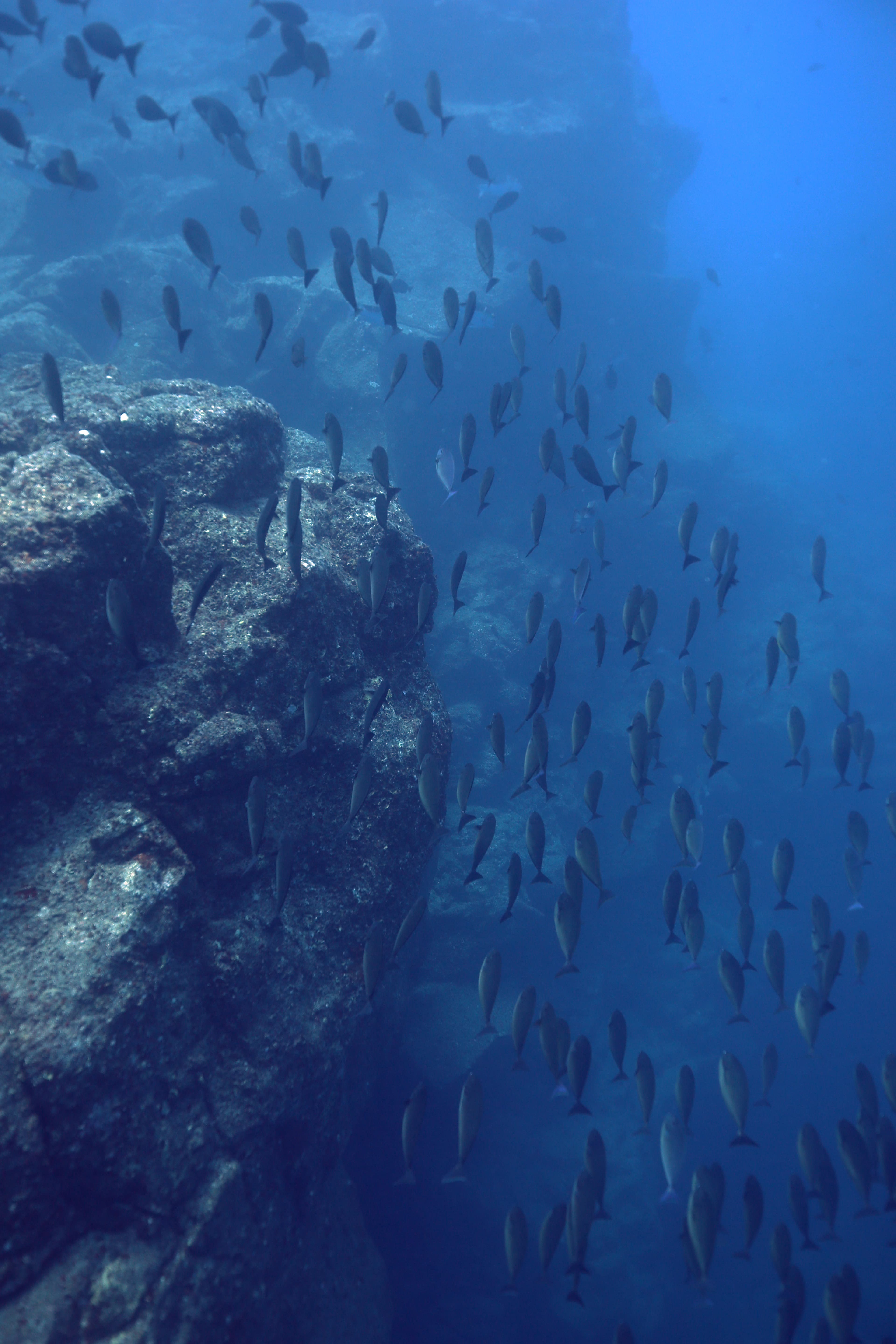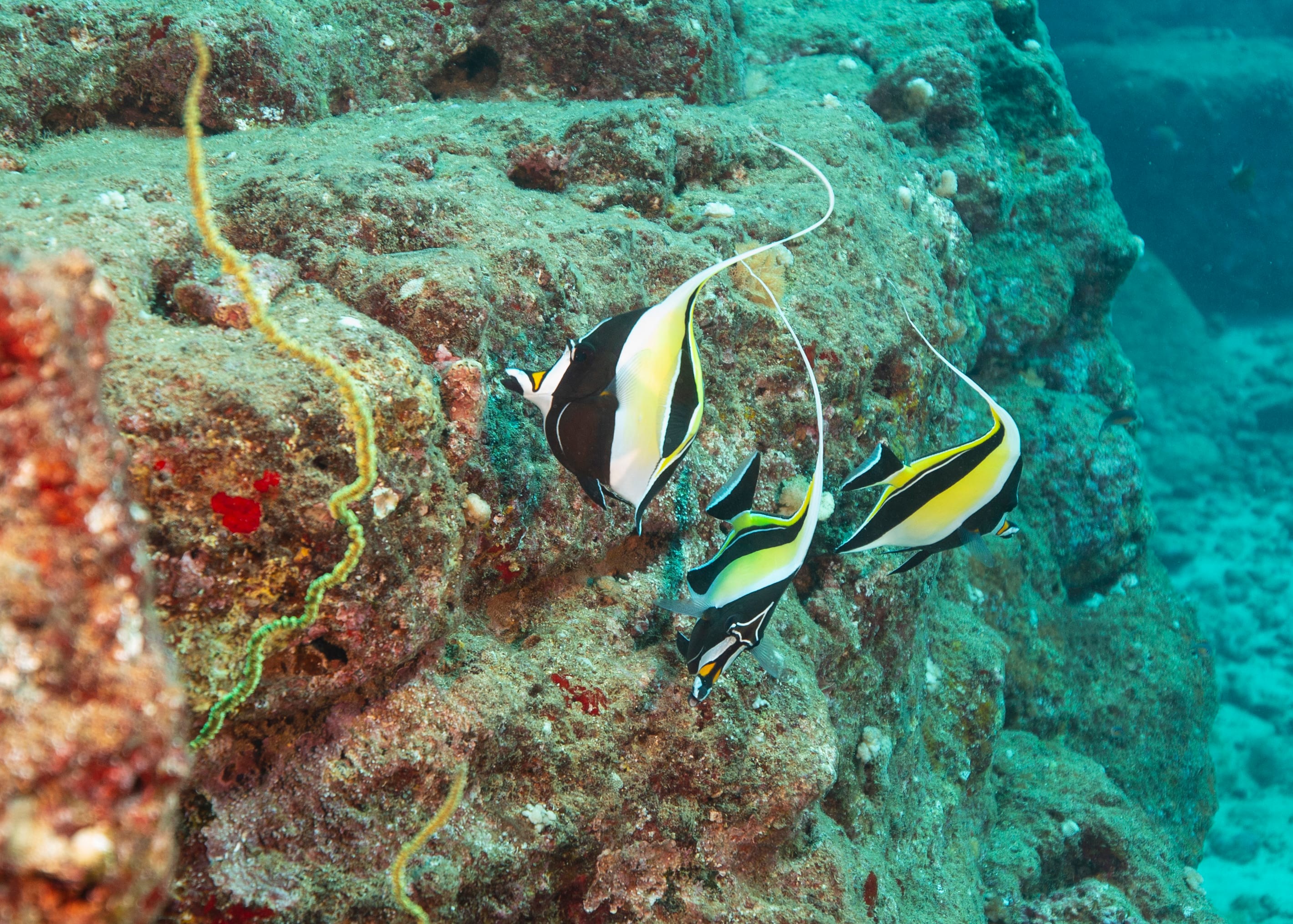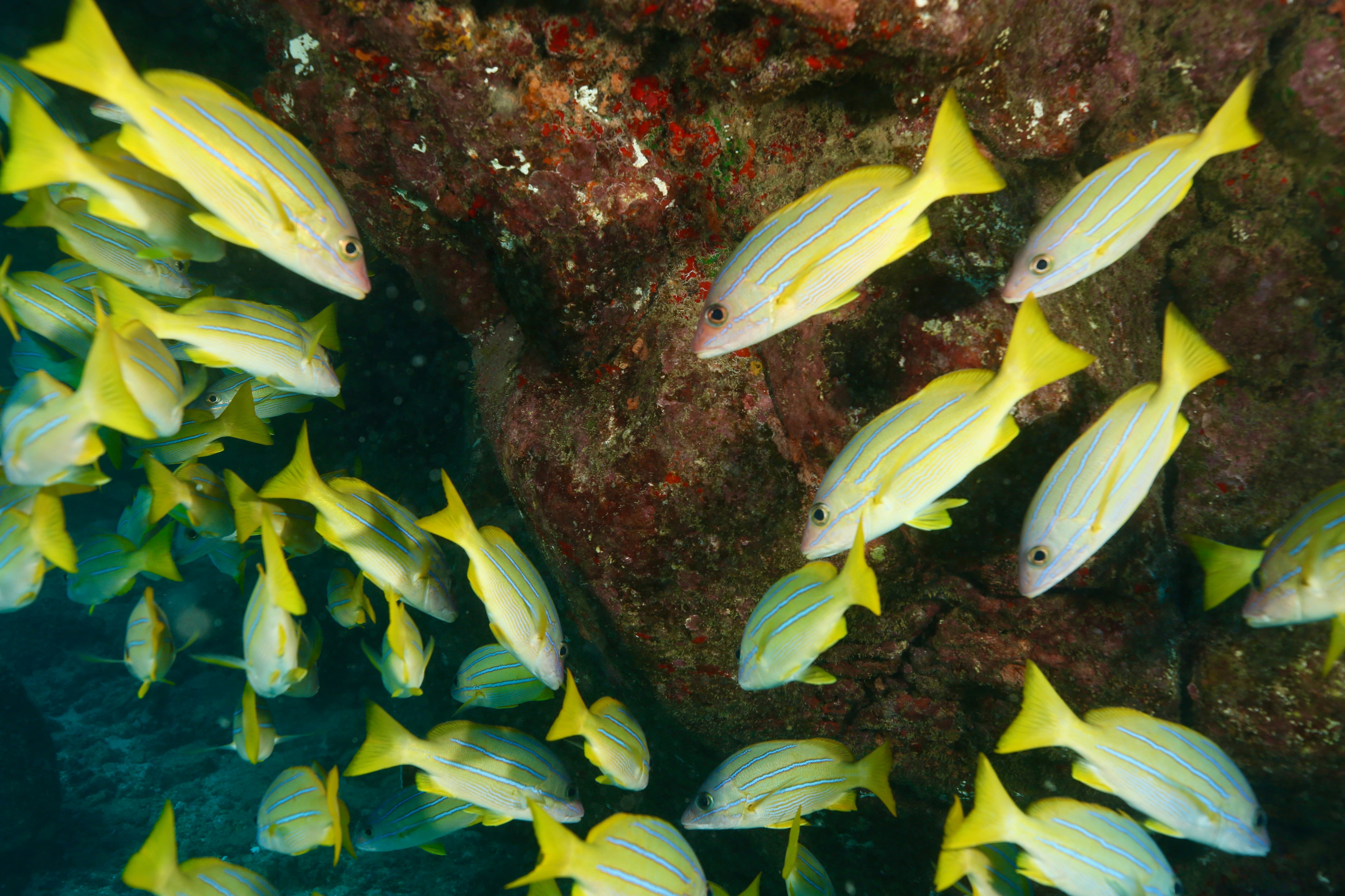 South side of Kauai diving today and just hunting for some good specimens that were acting photogenic. Large shoals of Pyramid Butterflies (Hemitaurichthys polylepis) and Bluestripe Snapper (Lutjanus kasmira) making their way around the reef. The very shy but major in heart and minor in size stars of the show were two dwarf angelfish: the Flame Angel (Centropyge loricula) and the Fisher’s Angel (Centropyge fisheri). Both are small, fast, and hard to snap, but they did give us some glimpses today.