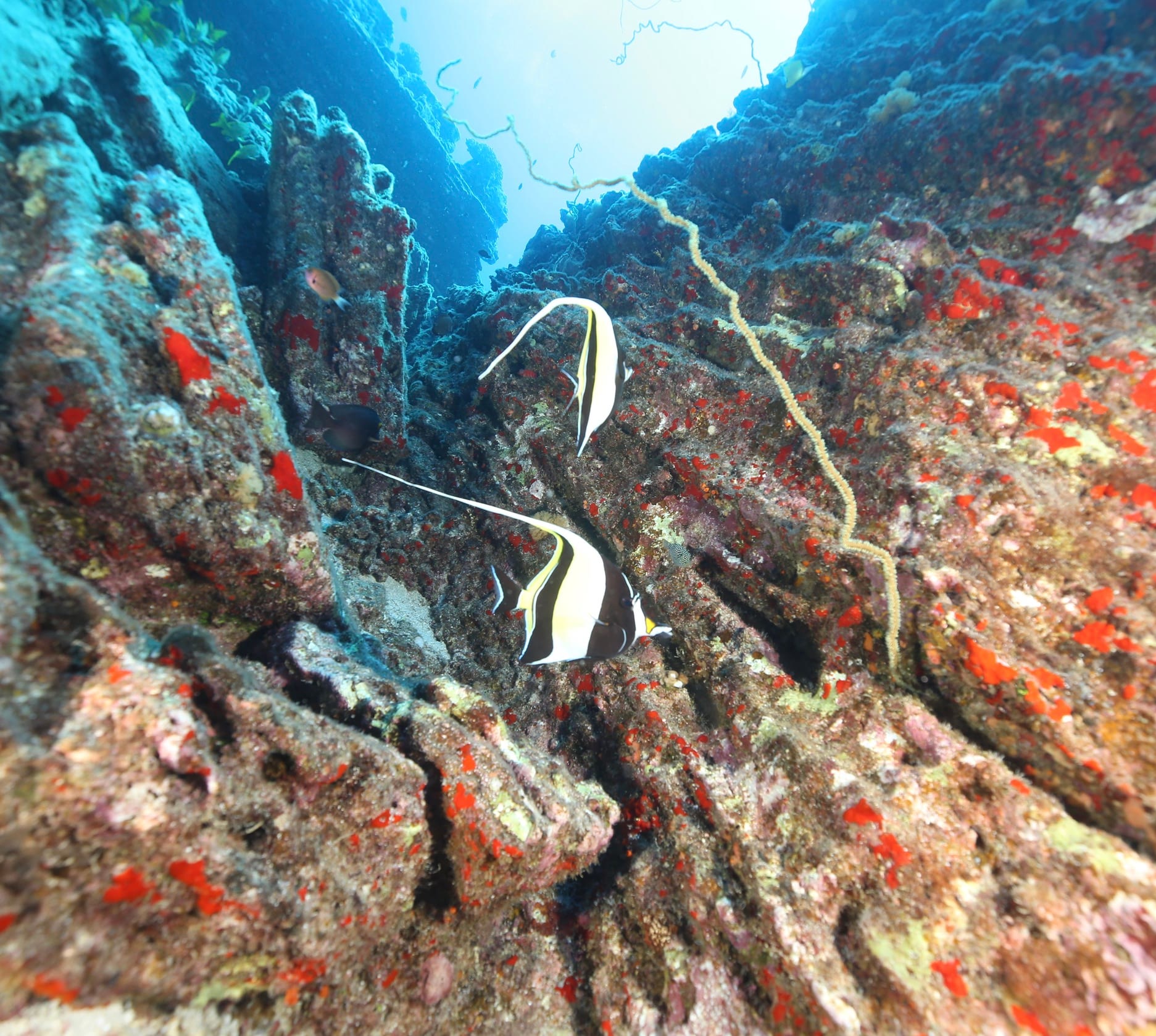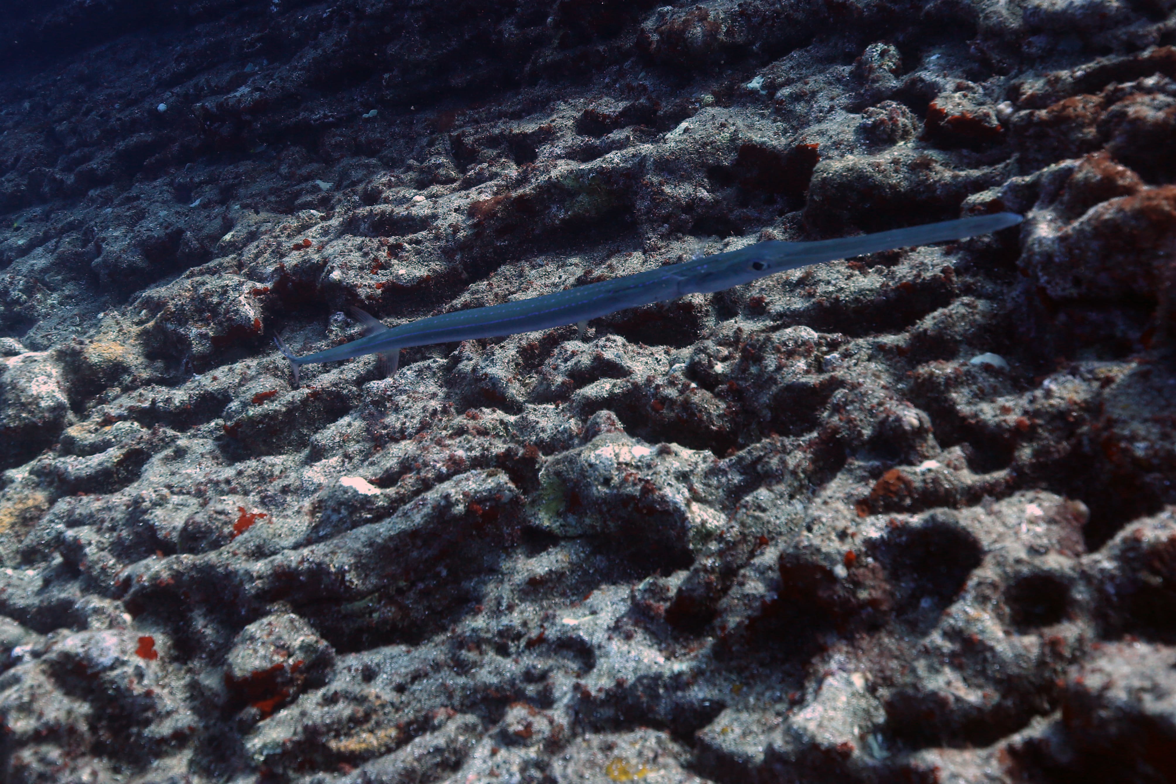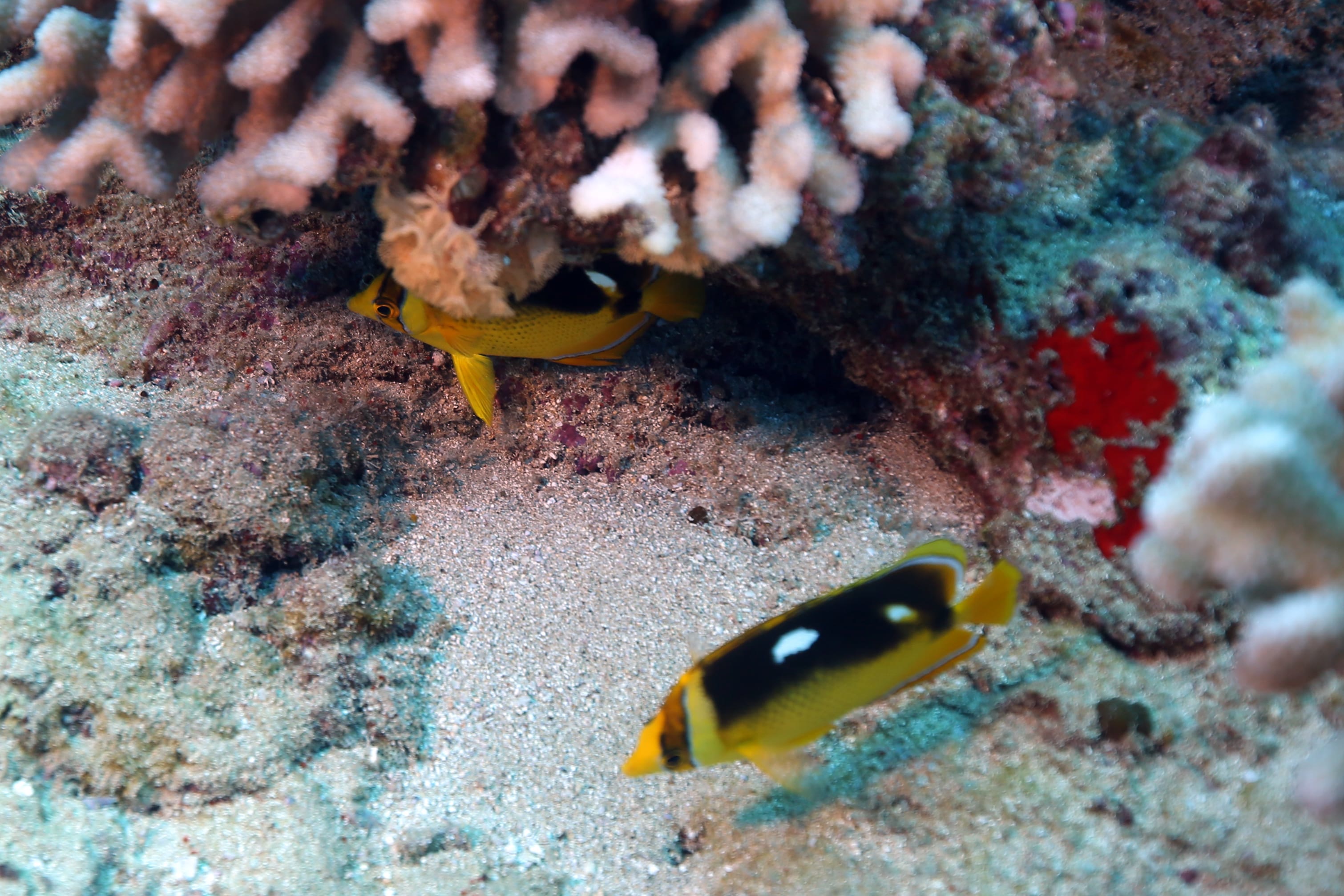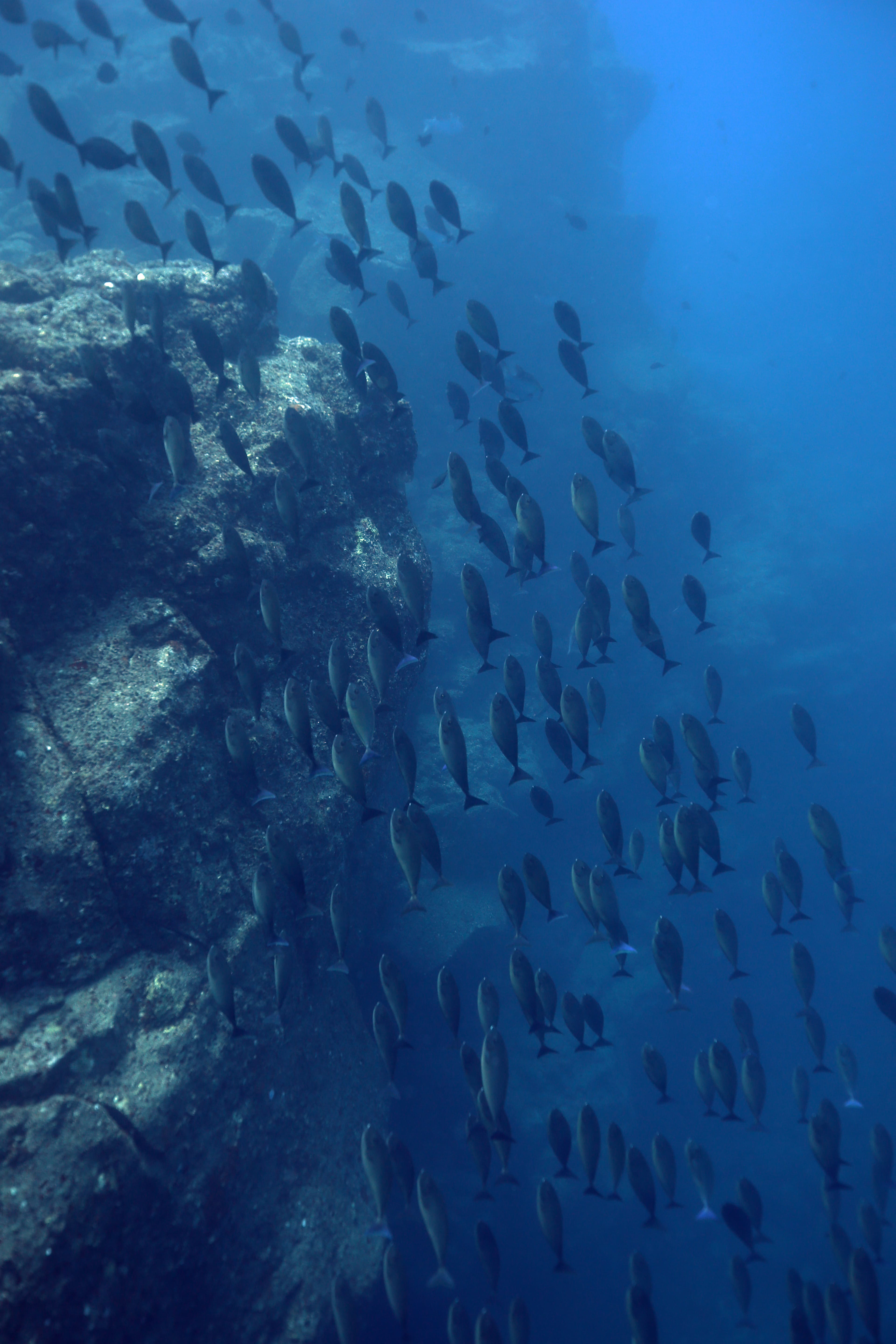 South side of Kauai diving today and just hunting for some good specimens that were acting photogenic. Large shoals of Pyramid Butterflies (Hemitaurichthys polylepis) and Bluestripe Snapper (Lutjanus kasmira) making their way around the reef. The very shy but major in heart and minor in size stars of the show were two dwarf angelfish: the Flame Angel (Centropyge loricula) and the Fisher’s Angel (Centropyge fisheri). Both are small, fast, and hard to snap, but they did give us some glimpses today.