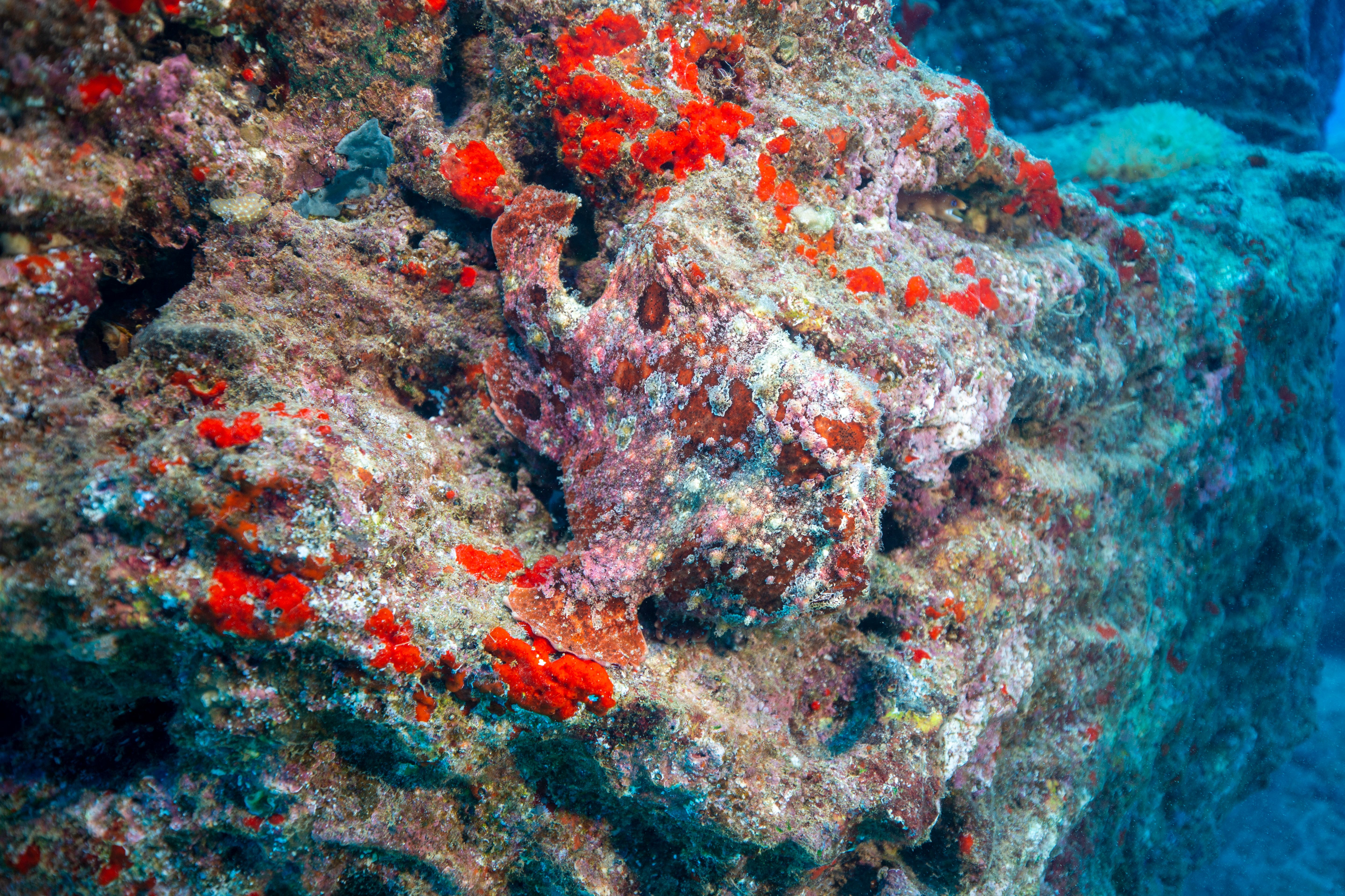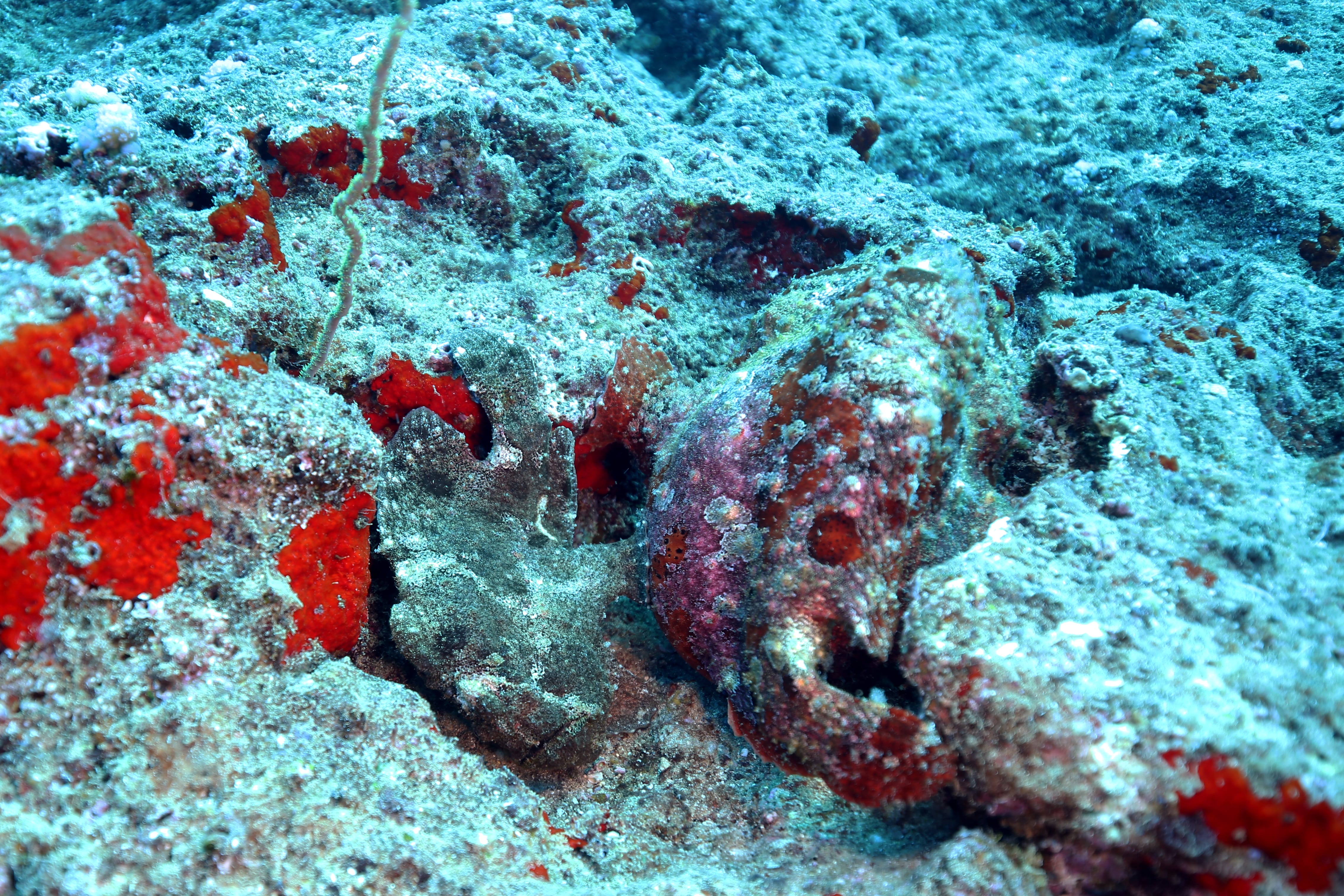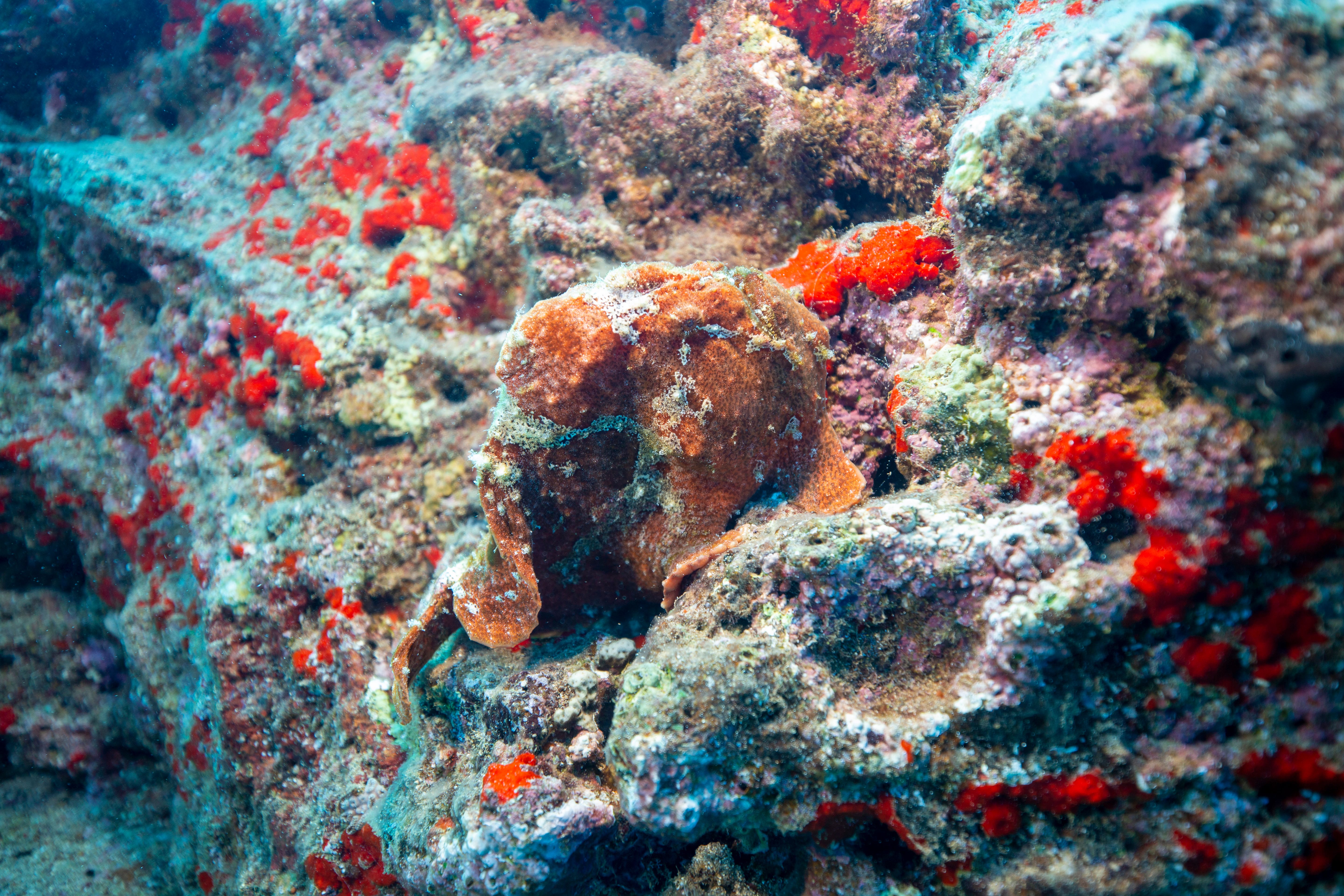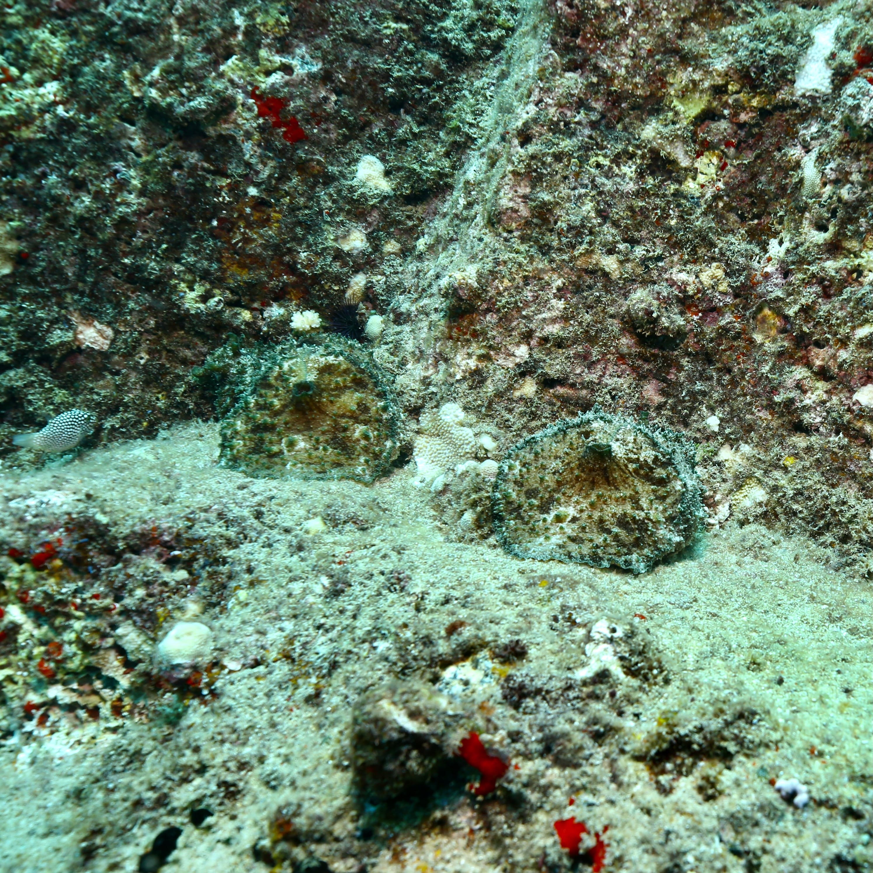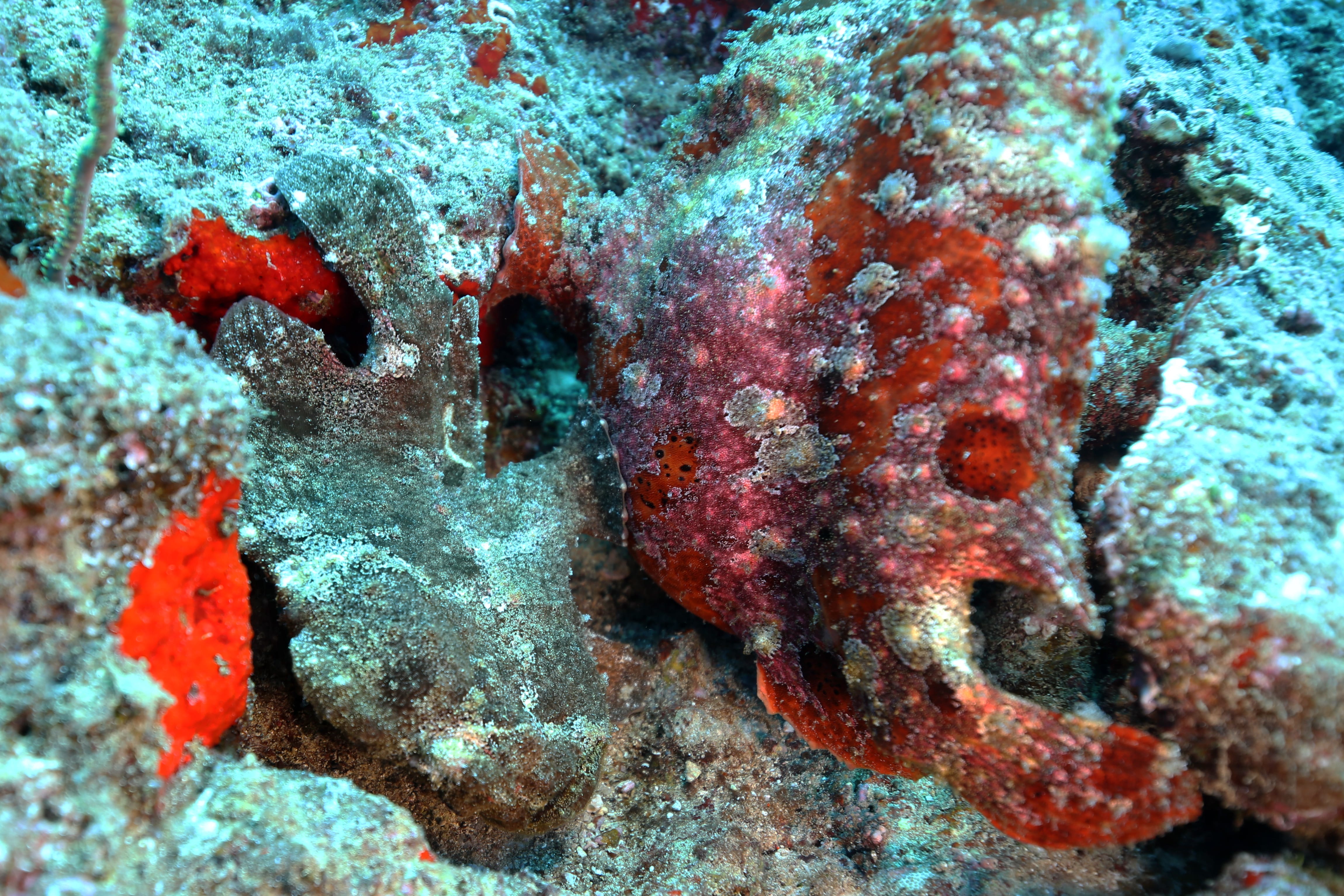 Took a short ride out to a typical Kauai, HI diving location named Turtle Bluffs. Two Frogfish nestled up against one another. There’s some debate as to whether these are Commerson or Painted frogfish but I really think they are Commersons. Also snapped some quick pics of a few other local residents. Enjoy!